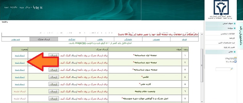در قسمت ارسال مدارک با کلیک بر روی دکمه ارسال در هریک از موارد خواسته شده، فایل اسکن شده مورد نظر را بارگذاری نمایید(حجم فایل باید کمتر از 500کیلوبایت و با فرمت image/jpg باشد)